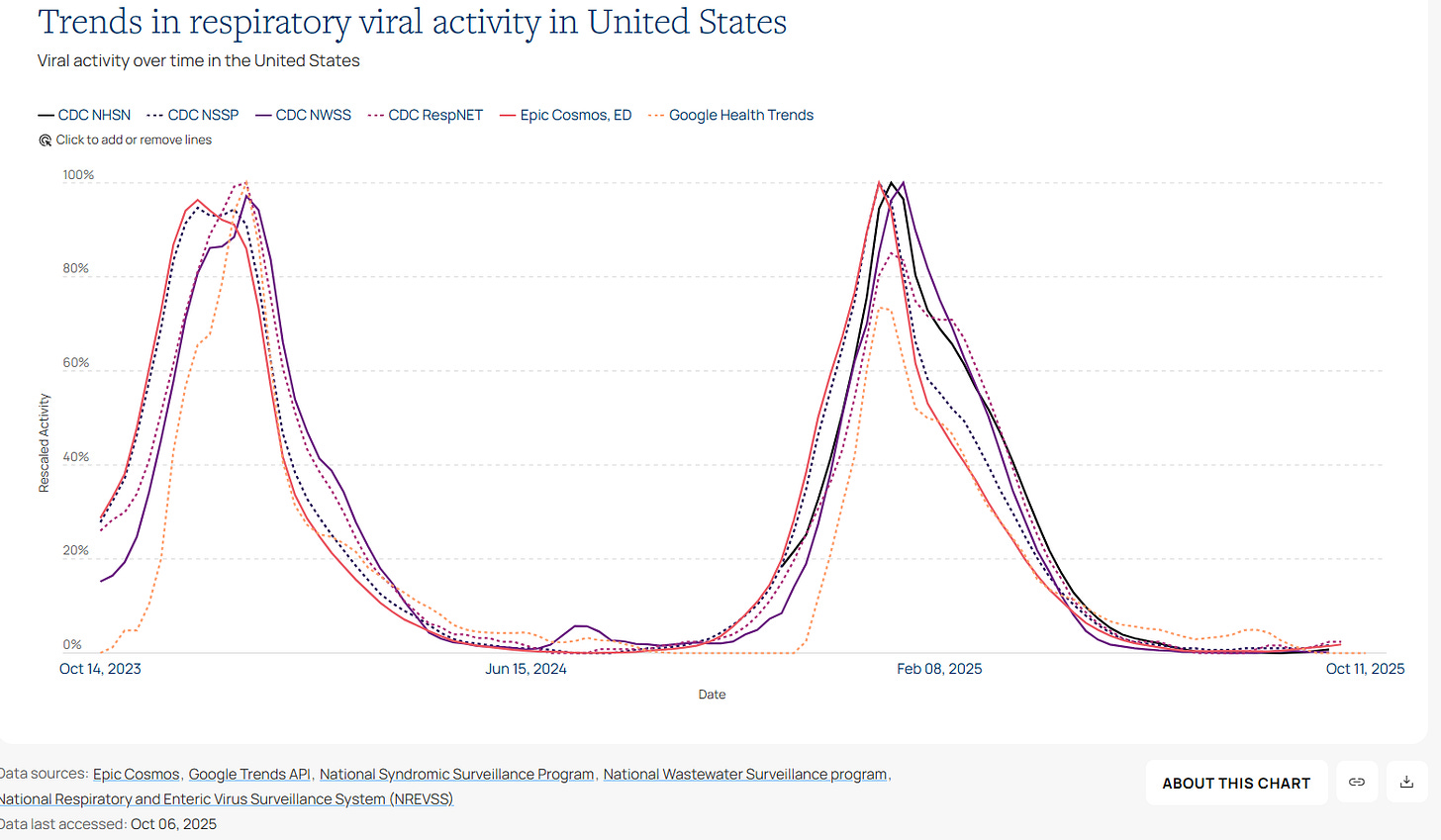 For clinical activity, we have data for hospitalizations and emergency departments from CDC NHSN (hospitalizations), NSSP (emergency department), RespNET (hospitalizations) data and the Epic Cosmos (emergency department) data.